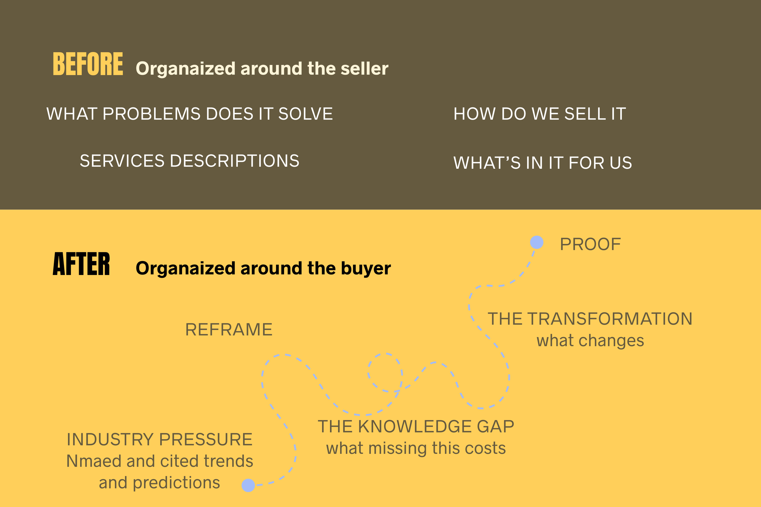 Product marketing had strong processes and deep fluency in the technology side. But the services business had grown up in a separate orbit — built and supported by the services team directly, without product marketing methodology behind it. The result was internal enablement organized around the company's own logic: service descriptions, problem lists, pricing, what it means for the selling organization. What it didn't do was translate any of it into why a buyer should care, or what would change for them. Sales, business development, and customer success were filling that gap with individual knowledge. Results varied significantly by region as a consequence. With seven services and substantial upsell opportunity in play, the inconsistency had a real cost.